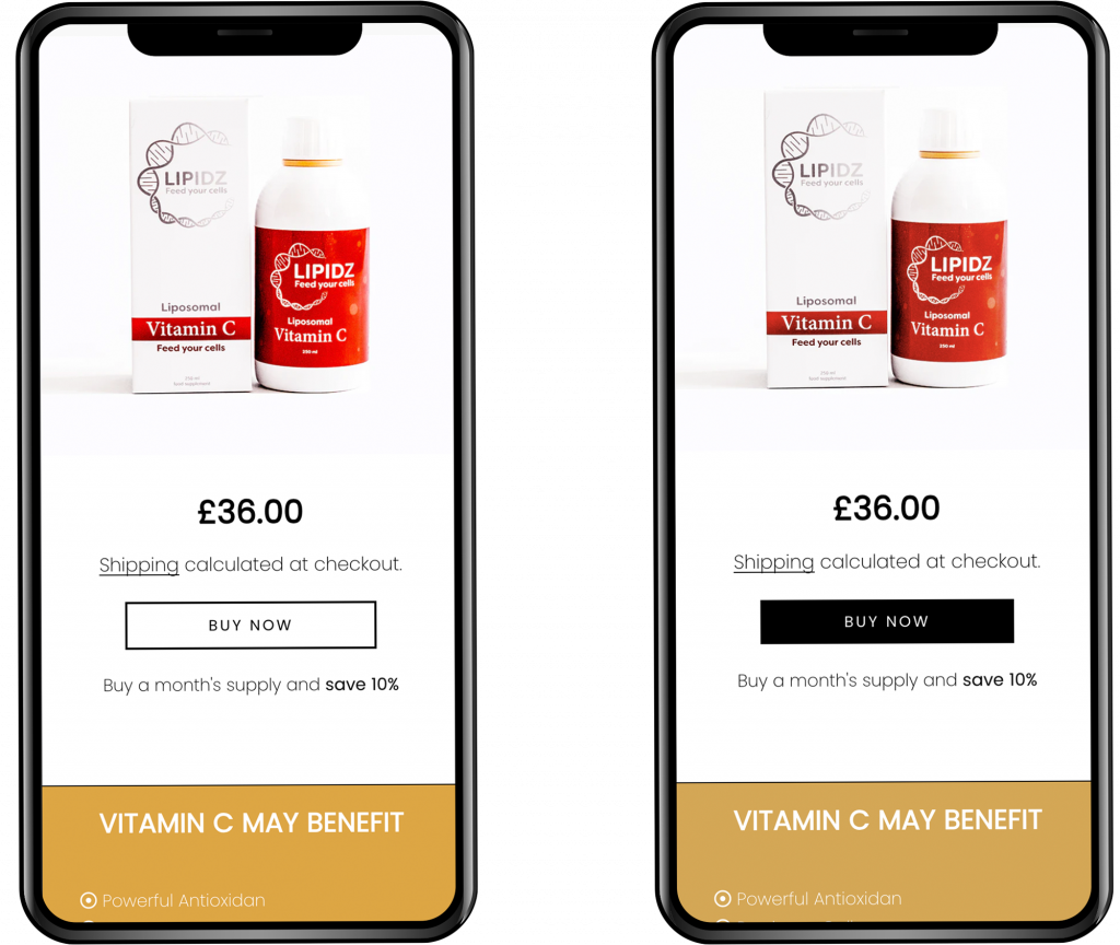 In version one (A), the CTA listed above the product image and the product description with the same outlined version that we have for the buttons on the rest of the site.